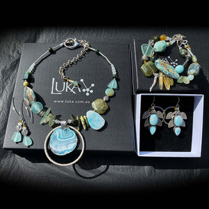 Such a delicious love affair of Aquamarine, Larimar, Agates, Amazonite, Agate, Oceanic Agate, handmade glass beads from Ghana with Jade, Fluorite, rough green garnet and yellow- green Turquoise.
